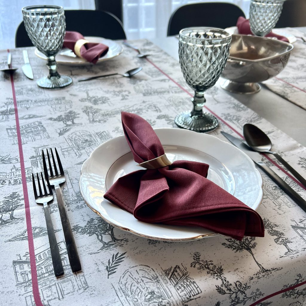 Nello stesso tessuto è disponibile anche la tovaglia (in varie misure) e il grembiule antimacchia, idrorepellente e no stiro, perfetto per la cucina e anche per il giardinaggio o il barbecue.